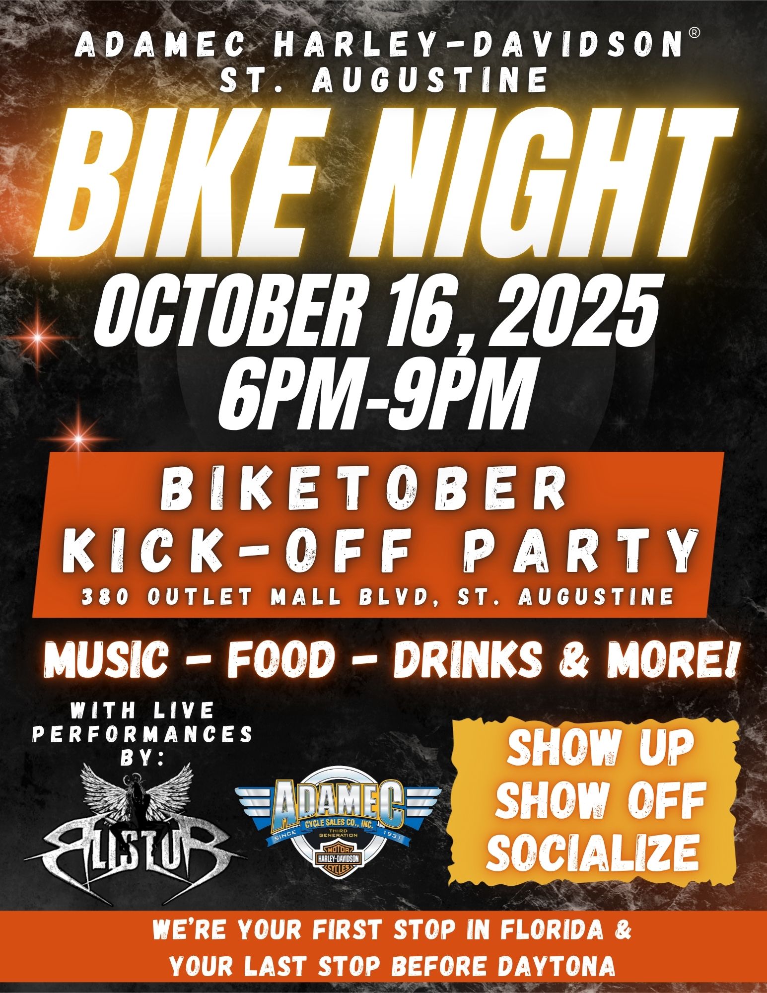 📍 Adamec Harley-Davidson® St. Augustine – 380 Outlet Mall BlvdWe’re kicking off BikeFest weekend in true Harley style with our Kickoff Party! Enjoy live performances, great food, cold drinks, and a night filled with riders, chrome, and community. Show up, show off, and socialize with fellow Harley enthusiasts before the big weekend begins.